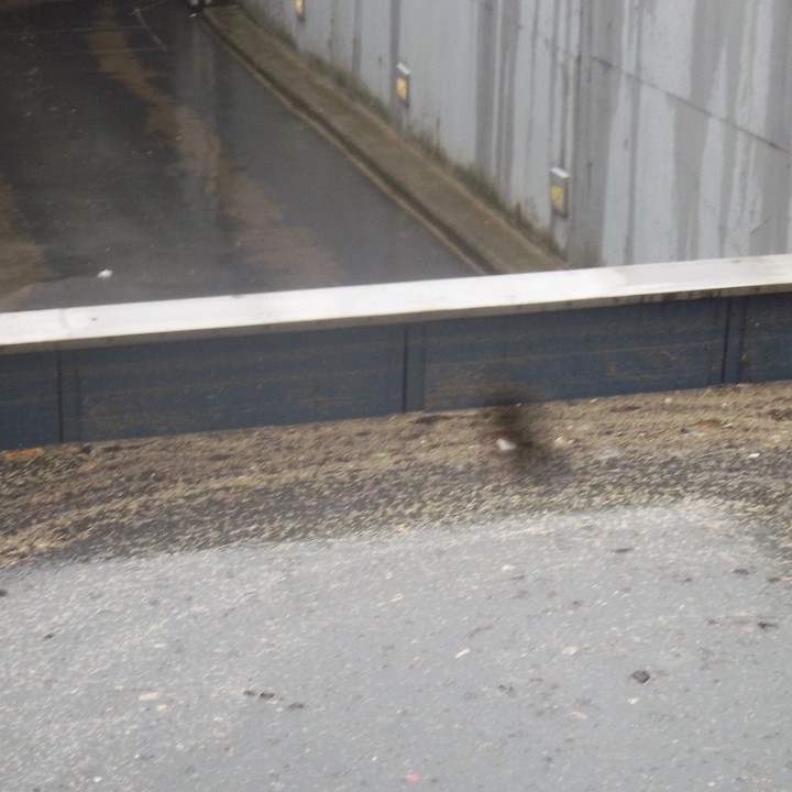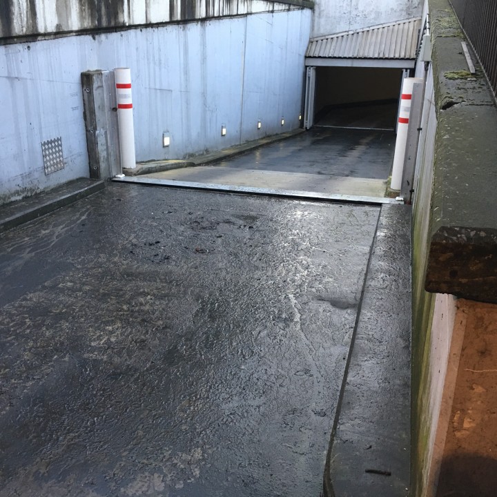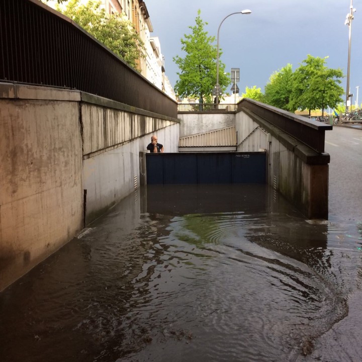 La sortie du parking Q-Park près de la gare de Berchem est située à basse altitude. En cas de pluie intense, les eaux de pluie entrent via cette sortie et inondent le garage. Les voitures garées se retrouvent les roues dans l’eau, et à cause du fort courant d’eau, il est quasiment impossible de les sortir du garage.